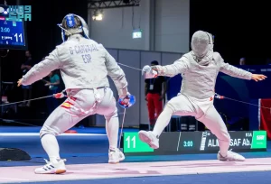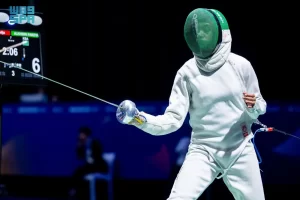 وخاض منتخب المبارزة منافسات الفرق لسلاح الأبية، التي تمكن خلالها من تحقيق المركز الثامن في الترتيب العامـ، وتغلب في دور الـ(32) على الفريق البريطاني بنتيجة (44 – 43)، ليلتقي في دور الـ(16) مع الفريق الكوري الجنوبي، ويتجاوزه بنتيجة (41 – 40) قبل أن يخسر من فرنسا في دور الـ(8) بنتيجة (45 -31)، ثم الخسارة من سويسرا وأوكرانيا (45 – 24)، و(45 -42)، في مواجهتي تحديد المراكز ليحتل الثامن في الترتيب العام لمنافسات الرجال.