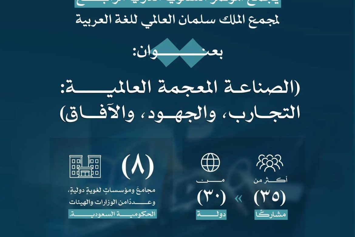 أعلن مجمع الملك سلمان العالمي للغة العربية بدء التسجيل لحضور مؤتمره السنوي الدولي الرابع المزمع عقده يومي الاثنين والثلاثاء، الموافق 06 – 07 أكتوبر 2025م في الرياض، برعاية صاحب السمو الأمير بدر بن عبدالله بن فرحان وزير الثقافة، رئيس مجلس أمناء المجمع، بعنوان: (الصناعة المعجمية في العالم: التجارب، والجهود، والآفاق).