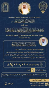 تحت رعاية خادم الحرمين الشريفين الملك سلمان بن عبدالعزيز آل سعود -حفظه الله- تنظم وزارة الشؤون الإسلامية والدعوة والإرشاد، المسابقة المحلية على جائزة الملك سلمان بن عبدالعزيز لحفظ القرآن الكريم وتلاوته وتفسيره للبنين والبنات في دورتها الـ(27) لعام 1447هـ، بجوائز يبلغ مجموعها (7) ملايين ريال للفائزين في أفرعها الستة.