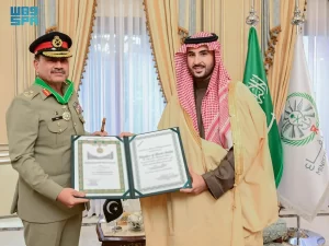 إنفاذًا لأمر خادم الحرمين الشريفين الملك سلمان بن عبدالعزيز آل سعود -حفظه الله-، قلَّد صاحب السمو الملكي الأمير خالد بن سلمان بن عبدالعزيز وزير الدفاع، معالي قائد الجيش الباكستاني المُشير عاصم منير، وسام الملك عبدالعزيز من الدرجة الممتازة؛ تقديرًا لجهوده المميزة في توطيد وتعزيز أواصر الصداقة والتعاون المشترك، وتطوير العلاقات السعودية الباكستانية.