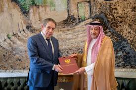 تسلم الرسالة نائب وزير الخارجية المهندس وليد بن عبدالكريم الخريجي، خلال استقباله، في مقر الوزارة بالرياض اليوم، سفير روسيا الاتحادية لدى المملكة سيرجي كوزلوف.