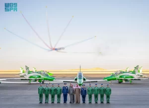 ثم توجه سموه إلى المنطقة الجوية، حيث التُقطت صورة تذكارية لسموه مع فريق الصقور السعودية، كما وقًّع على طائرة “هوك تي 165”.
